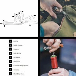 L’outil multifonctions Leatherman Surge propose 21 fonctions (outils auto-bloquants : sécurité optimale), dont une lame de couteau polyvalente (lame de couteau à tranchant mixte, semi-denté), une lame à tranchant lisse avec pointe à tracer, une lime à bois et à métal, une scie à bois, une règle graduée en pouces et en centimètres, un ouvre-boîtes, un décapsuleur, un poinçon alésoir avec chas d’aiguille (utile pour gratter, percer, calibrer ou coudre), un dénudeur de fils électriques, un grand tournevis plat, un porte-embouts, deux embouts réversibles avec tournevis plats et tournevis cruciformes ainsi qu’une pince multifonction performante, à la fois pince à bec effilé, pince normale, cisailles, coupe-fils, pince coupante pour fil torsadé, pince coupante pour fil dur et pince à sertir. En résumé, acheter un Leatherman Surge, c’est opter pour un outil multifonction complet, de grande qualité. Remarque : le Leatherman Surge est livré avec un étui Leatherman.